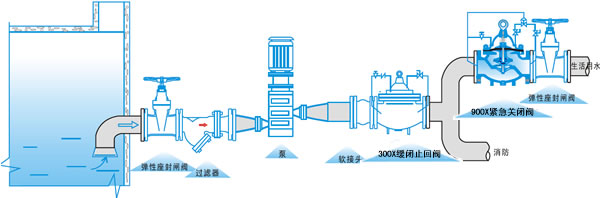 900X緊急關(guān)閉閥用于生活供水和消防供水并聯(lián)供水系統(tǒng)中,正常情況供生活用水,當(dāng)火災(zāi)發(fā)生時消防用水時,閥門自動關(guān)閉生活用水,確保足夠的消防用水。當(dāng)消防停止用水時壓力減少,閥門自動恢復(fù)生活用水,該閥使系統(tǒng)無須另設(shè)專門的消防單獨(dú)供水管網(wǎng),大大地節(jié)省了工程建設(shè)成本和日常的用水量。該閥控制靈敏、可靠、調(diào)試簡單、使用壽命長。