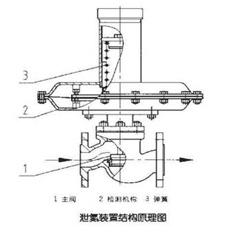 泄氮裝置結(jié)構(gòu)如右圖所示,該裝置采用內(nèi)反饋結(jié)構(gòu),介質(zhì)直接經(jīng)閥蓋進(jìn)入檢測(cè)機(jī)構(gòu)(2),介質(zhì)在檢測(cè)元件上產(chǎn)生一個(gè)作用力與預(yù)設(shè)彈簧(3)預(yù)緊力相平衡。當(dāng)罐內(nèi)壓力升高到高于泄氮裝置壓力設(shè)定點(diǎn)時(shí),平衡被破壞,使閥芯(1)上移,打開閥門,向外界泄放氮?dú)猓划?dāng)罐內(nèi)壓力降到泄氮裝置壓力設(shè)定點(diǎn)時(shí),由于預(yù)設(shè)彈簧力作用,關(guān)閉閥門。