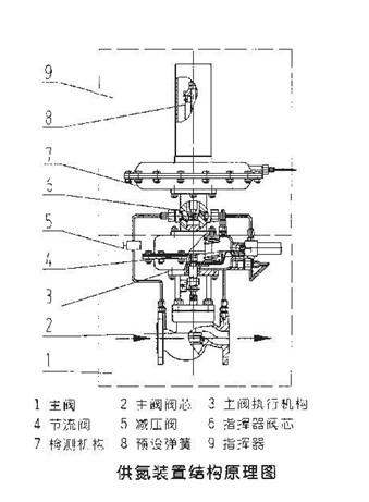 供氮裝置結(jié)構(gòu)如右圖所示,將設(shè)在罐頂?shù)娜狐c(diǎn)的介質(zhì)經(jīng)導(dǎo)壓管引入檢測(cè)機(jī)構(gòu)(7)、介質(zhì)在檢測(cè)元件上產(chǎn)生一個(gè)作用力與彈簧(8)、預(yù)緊力相平衡。當(dāng)罐內(nèi)壓力降低到低于供氮裝置壓力設(shè)定點(diǎn)時(shí),平衡被破壞,使指揮器閥芯(6)打開,從而使閥前氣體經(jīng)減壓閥(5)、節(jié)流閥(4)、進(jìn)入主閥執(zhí)行機(jī)構(gòu)(3)上、下膜室,打主開閥閥芯(2)、向罐內(nèi)充注氮?dú)?;?dāng)罐內(nèi)壓力升到供氮裝置壓力設(shè)定點(diǎn)時(shí),由于預(yù)設(shè)彈簧力,關(guān)閉指揮器閥芯(6)又由于主閥執(zhí)行機(jī)構(gòu)中彈簧作用,關(guān)閉主閥,停止供氮。